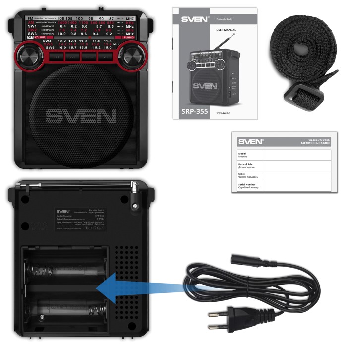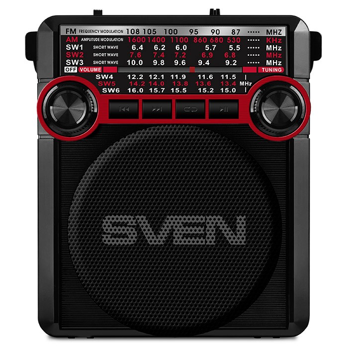 SVEN SRP-355 Roșu, radio FM/AM/SW, 3W RMS, receptor radio cu 8 benzi, player de fișiere audio încorporat de pe dispozitive de stocare USB-fash, microSD și card SD, antenă telescopică pivotantă, baterie încorporată