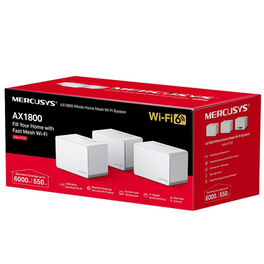 MERCUSYS Halo Halo H70X (3-pack) AX1800 Mesh Wi-Fi 6 System, 3 x Gigabit LAN Port, 1201Mbps pe 5GHz + 574Mbps pe 2.4GHz, 802.11ax/ac/b/g/n, Beamforming, Wi-Fi Dead-Zone Killer, Seamless Roaming with One Wi-Fi Name, Parrents control