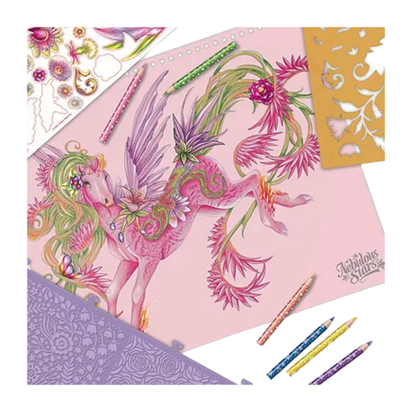 Set: 35 de pagini roz cu schițe, 80 de șabloane, 4 desene, 12 creioane colorate