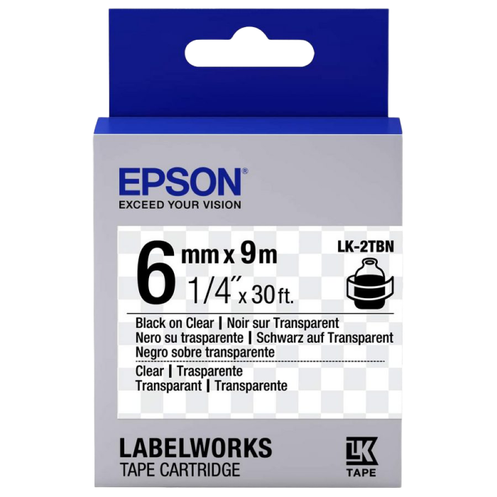 Caracteristici Cartuș de bandă EPSON LK2TBN; 6mm/9m Transparent, Blk/Clear, C53S652004
