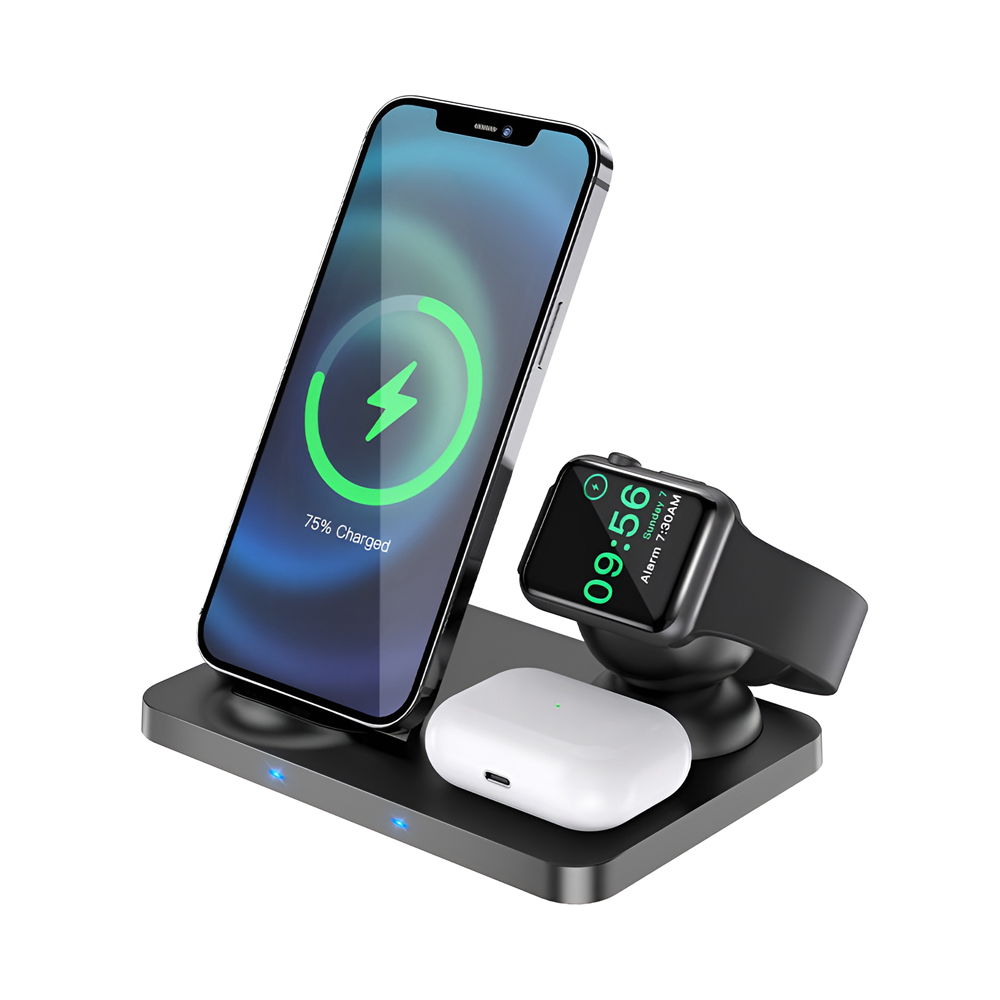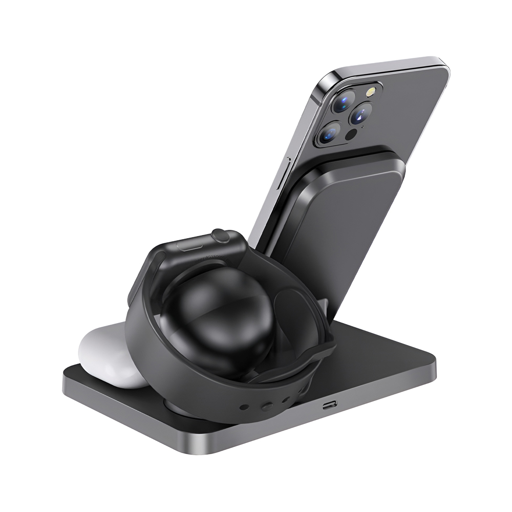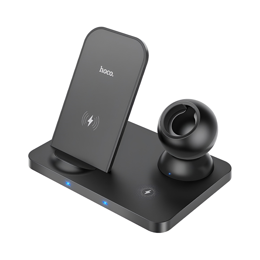 Hoco Wireless Charger Type-C Type-C PD/QC 3in1 CW33 Ultra 15W, Black - это многофункциональная беспроводная зарядная станция, предназначенная для одновременной зарядки трех совместимых устройств: смартфона, беспроводных наушников и смарт-часов. Благодаря компактному и современному дизайну это зарядное решение идеально подходит для пользователей, которым важны эффективность, организованность и расширенная совместимость в одном аксессуаре