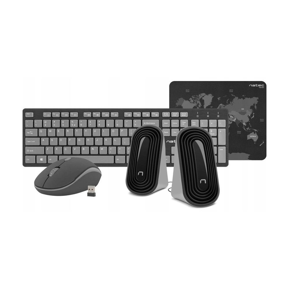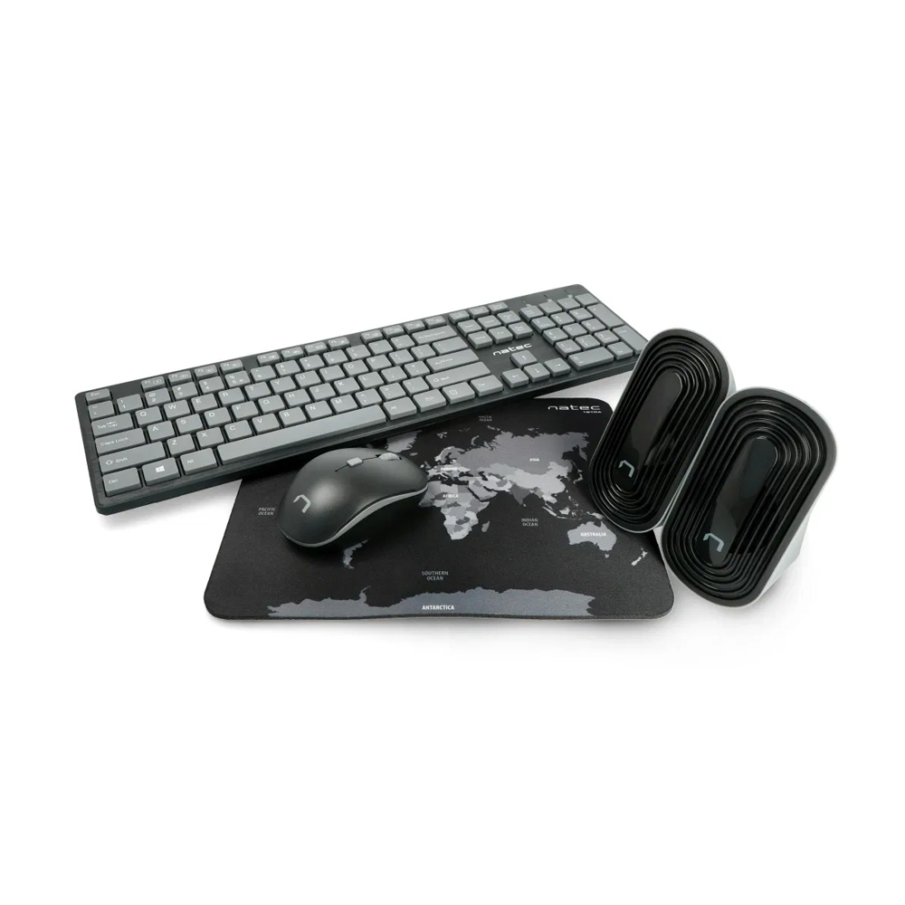 Natec Wireless Combo Keyboard + Mouse + Mouse Pad + Speakers Tetra, Black/Grey NKL-1179 - это полный и стильный комплект, предназначенный для пользователей, которым важны эффективность, современный дизайн и расширенная функциональность в одном корпусе. Идеально подходящий для офиса или личного использования, этот комплект включает в себя тонкую беспроводную клавиатуру, эргономичную мышь, компактные стереодинамики и коврик для мыши с образовательным дизайном