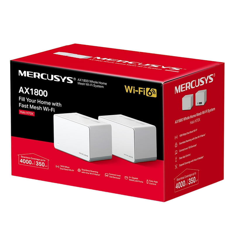 MERCUSYS Halo H70X (2 шт.) AX1800 Mesh Wi-Fi 6 System, 3 x Gigabit LAN Port, 1201 Мбит/с на 5 ГГц + 574 Мбит/с на 2,4 ГГц, 802.11ax/ac/b/g/n, Beamforming, Wi-Fi Dead-Zone Killer, Seamless Roaming with One Wi-Fi Name, Parrents control