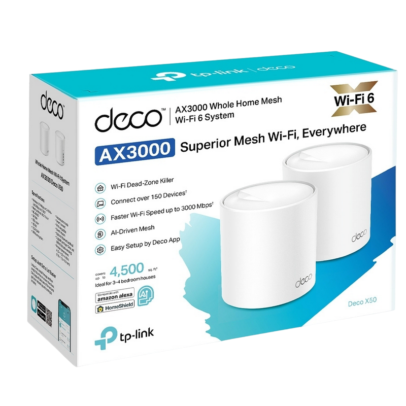 TP-LINK Deco X50 (2 шт.) AX3000 Mesh Wi-Fi 6, 2 LAN/WAN гигабитных порта, 2402 Мбит/с на 5 ГГц + 574 Мбит/с на 2,4 ГГц, 802.11ax/ac/b/g/n, OFDMA , MU-MIMO, Wi-Fi Dead-Zone Killer, бесшовный роуминг с одним именем Wi-Fi, антивирус, родительский контроль