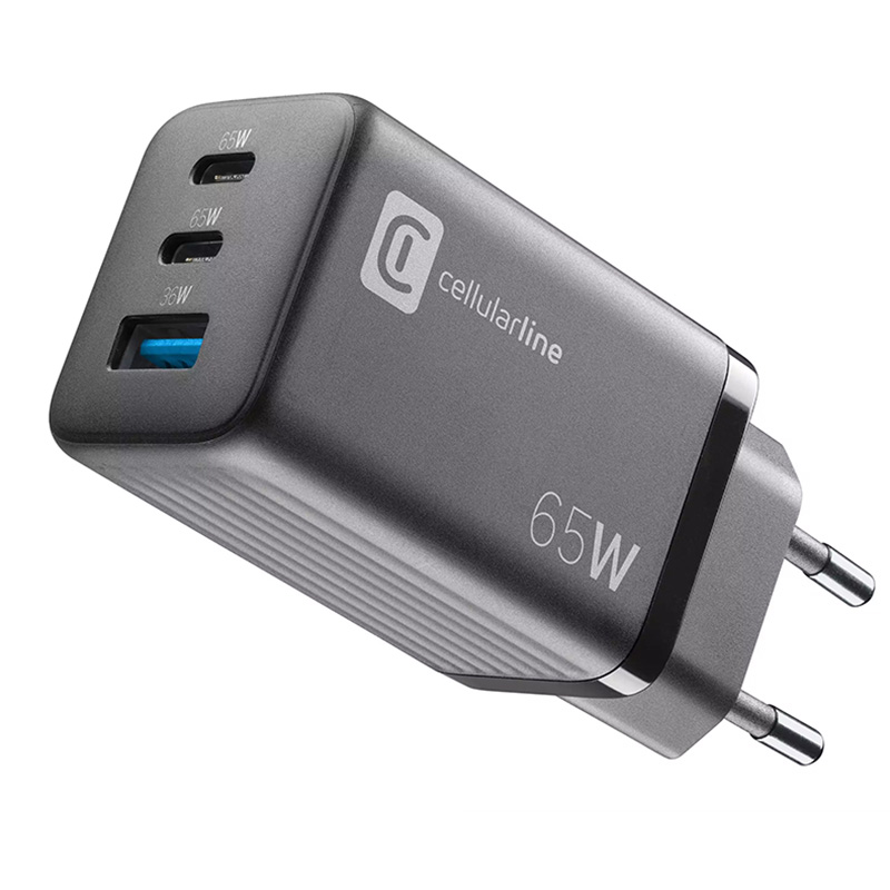 Особенности Зарядное устройство Cellularline Wall Charger GAN, 3 Ports, 65Вт, Чёрный