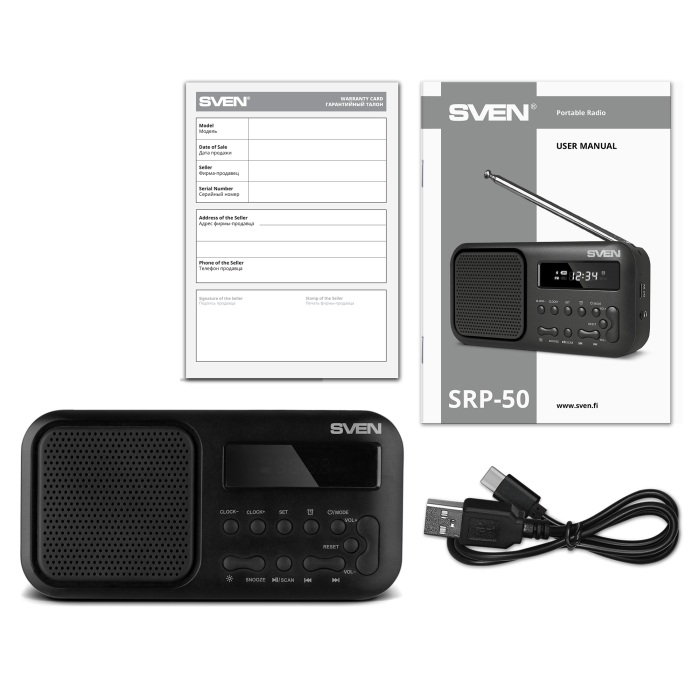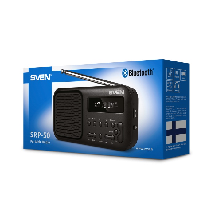 SVEN SRP-50 Black, Bluetooth, LED дисплей, встроенные часы, FM радио, 3 Вт RMS, телескопическая поворотная антенна, встроенный аккумулятор 500 мАч, Type-C