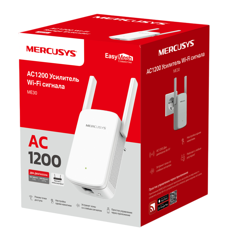 Особенности Усилитель Wi‑Fi сигнала MERCUSYS ME30, 300 Мбит/с, 867 Мбит/с, Белый