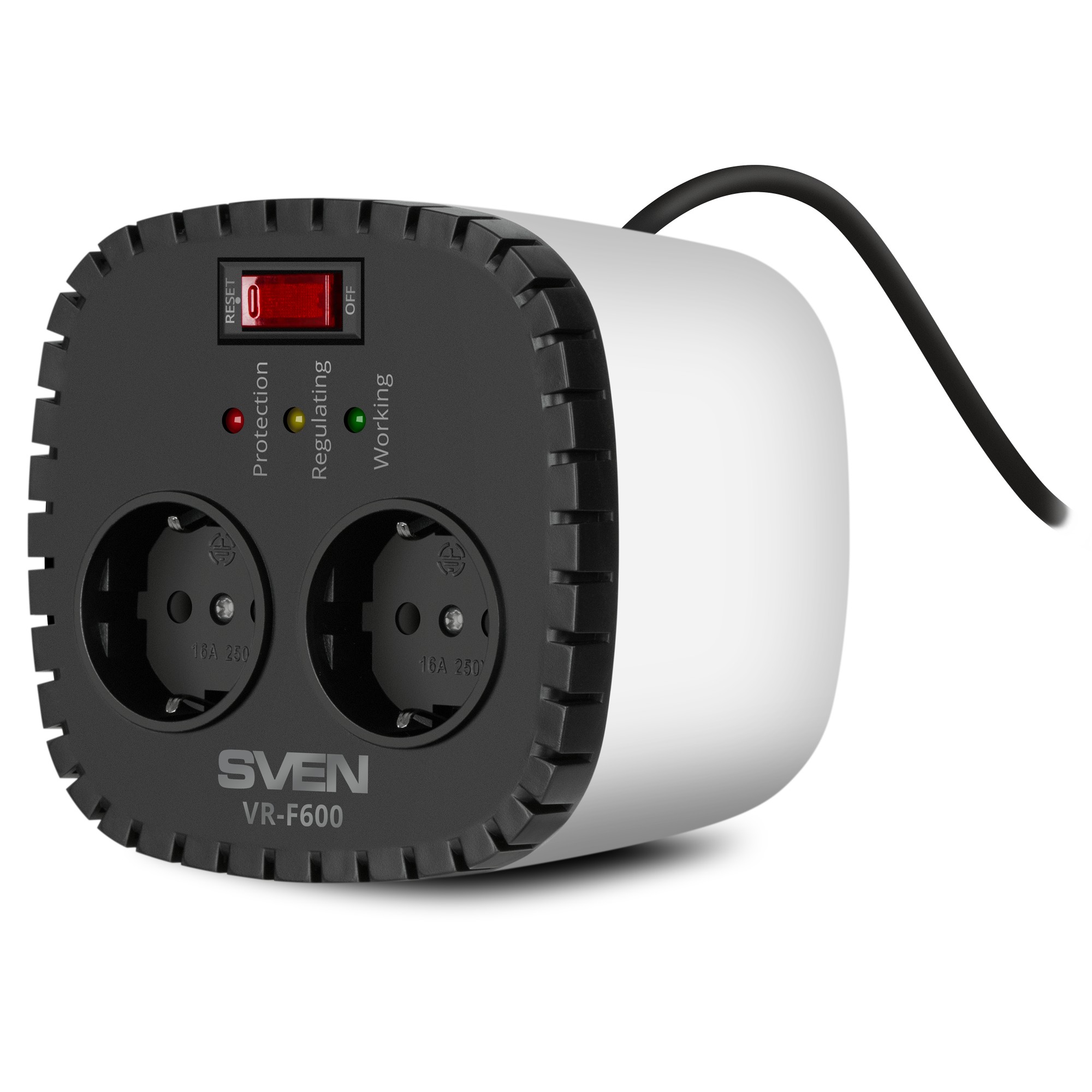 SVEN VR-F600, 200W, Regulator automat de tensiune, 2x prize Schuko, Tensiune de intrare: 170-285V, Tensiune de ieșire: 230V ± 10%, indicatori de diod pe panoul frontal, corp din plastic, argintiu și negru