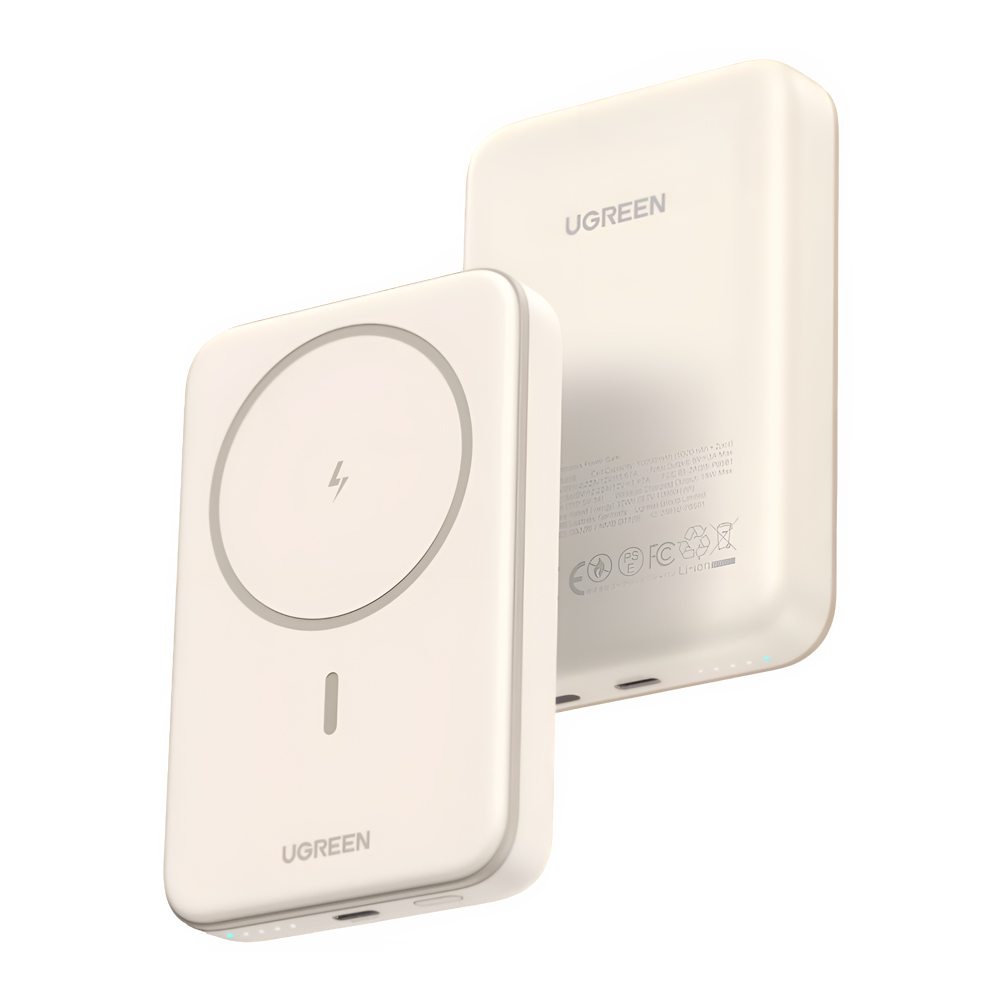 Внешний аккумулятор UGREEN Mini Magnetic Wireless, емкостью 10000 мАч и мощностью зарядки 20 Вт, бежевого цвета - это портативное, компактное и элегантное решение для зарядки совместимых устройств с беспроводной зарядкой.
