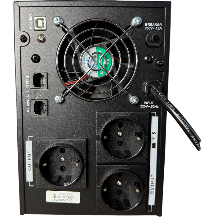 UPS3000 3000 VA/1800 W Panou frontal: Ecran LCD AVR: 3 trepte AVR, control procesor Interval tensiune de intrare: 175~275 V c.a. Interval frecvență de intrare: 50 Hz / 60 Hz (detectare automată) Interval de tensiune de ieșire: 198~242 V c.a. Frecvență de ieșire (mod c.c.): 50±0,5 Hz / 60±0,5 Hz Formă de undă: PWM (mod c.c.) Timp de tranziție: De obicei 2~6 ms, max. 10 ms. 3 prize germane RJ45/11 și USB Baterie: 4 buc. * 12 V 9 Ah Perioadă de încărcare: 4~6 ore până la recuperarea a 90% din capacitate PROTECȚIE: 1. Protecție împotriva tensiunii scăzute a bateriei 2. Protecție împotriva suprasarcină 3. Protecție împotriva scurtcircuitului FUNCȚII: 1. Repornire automată la restabilirea alimentării cu curent alternativ 2. Setare pentru funcționare silențioasă 3. Încărcare automată (încărcare autonomă) Dimensiuni dispozitiv (mm): 340*110*265 Greutate netă (kg): 20 kg