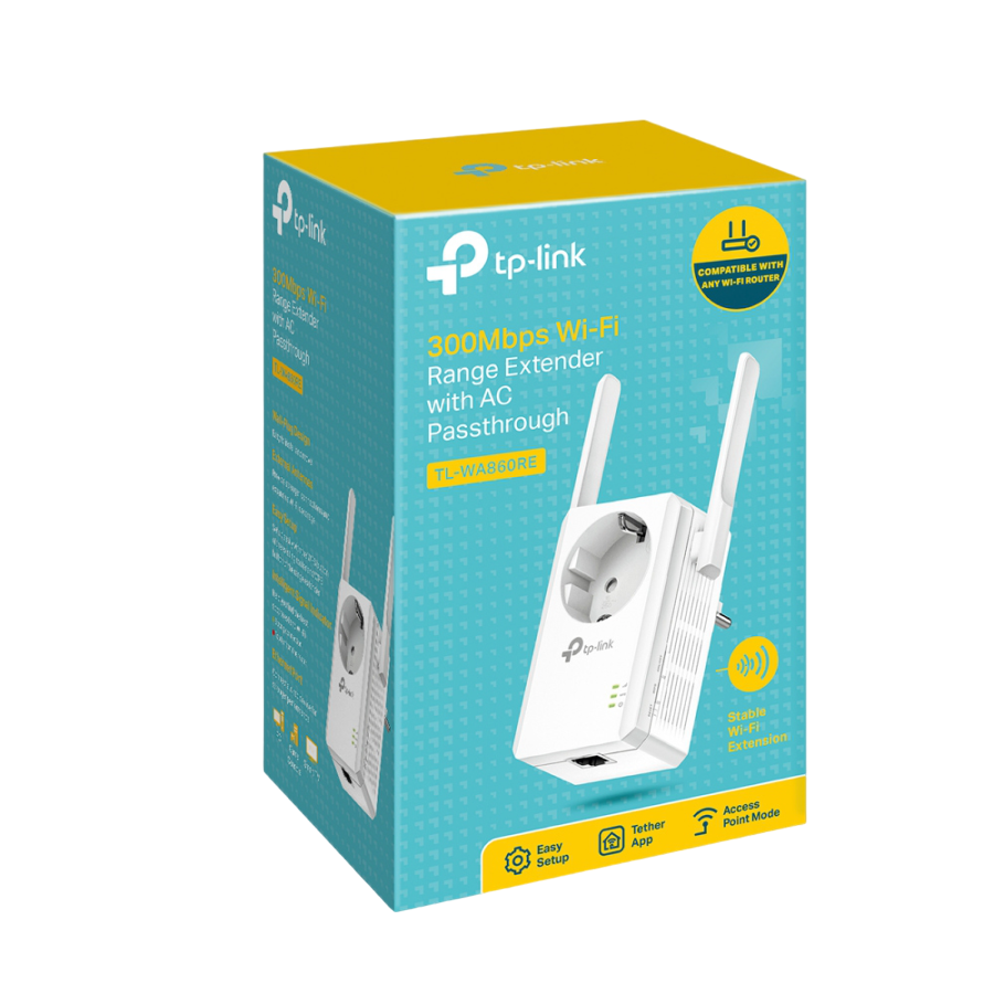 TP-LINK TL-WA860RE N300 Extender wireless de perete cu AC Passthrough, 300Mbps 2.4GHz, 802.11n/g/b, mod Ranger Extender, 1 port LAN, WPS, 2 antene externe